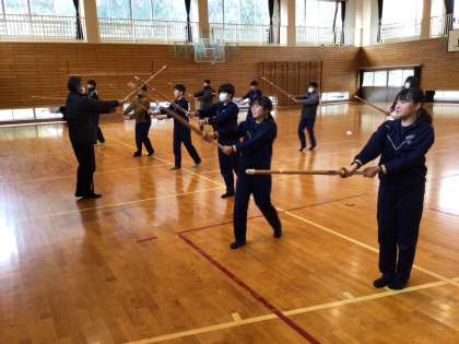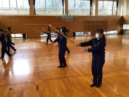 剣道の足さばきから面打ちを練習。素足は冷たいので靴下で練習です。