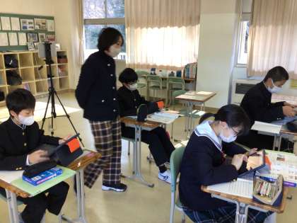 新出単語の発音をタブレットで確認中!