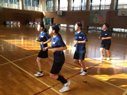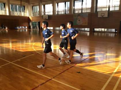 雨上がりで校庭がゆるいため、屋内で調整です。