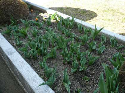 校舎西側の花壇には、チューリップの球根が植えられています。そのチューリップがすくすくと育っています。東日本大震災に遭っても力強く育っています。花が咲くのがとても楽しみです。