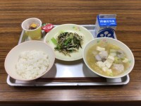 26日(木)の給食のメニューは、「八宝菜めん、春巻、もやしのラー油あえ、牛乳」です。