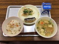 今日の献立は、麦ごはん、しそ味ひじき、牛乳、ししゃもの天ぷら、かぶとキャベツのごまあえ、南蛮汁です。