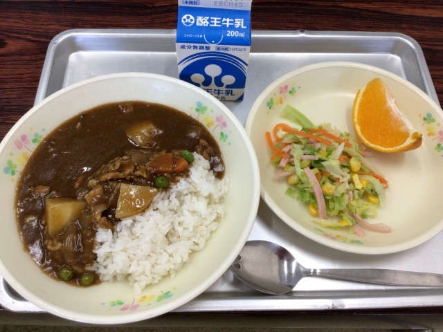 2月13日(木)今日の給食は「ハヤシライス、牛乳、コーンサラダ、デコポン」です。