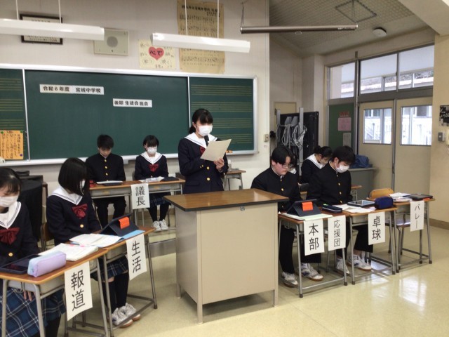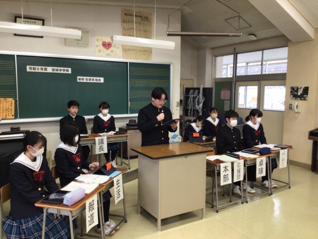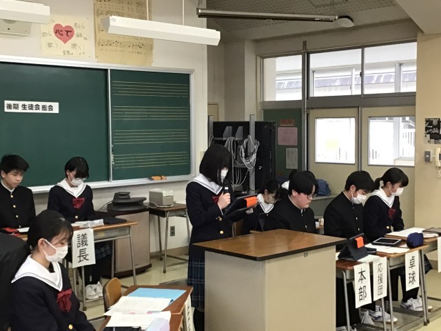 各委員会、応援団、各部活動の活動内容や次年度の目標について全校生で確認しました。