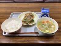 今日のメニューは、麦ごはん、牛乳、ますの三味焼き、コーン入りマヨネーズ和え、生揚げのみそ汁です。