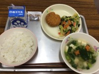 今年度、最後の給食です。ごはん、メンチカツ、わかめ入りおひたし、小松菜のみそ汁、...