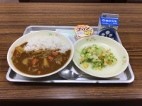 今日のメニューは、ポークカレーライス、チーズサラダ、大豆プリン、牛乳です。
