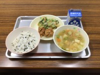 今日のメニューは、わかめごはん、鶏肉の竜田揚げ、ほうれん草のごまあえ、えのきた...