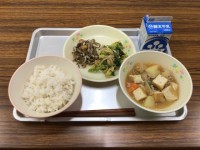今日のメニューは、麦ごはん、生揚げの肉みそ煮、大豆と小魚の佃煮、春キャベツのおひ...