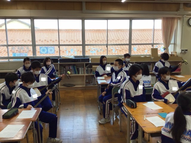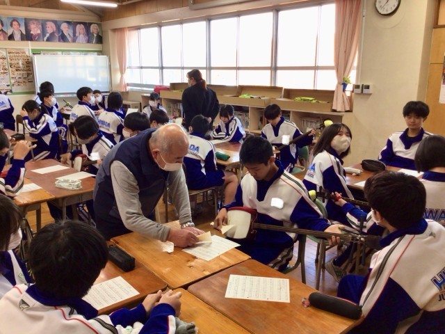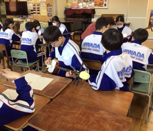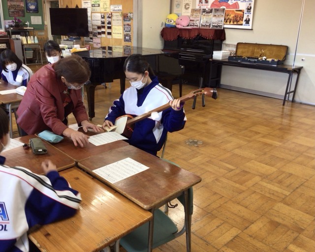 今週、音楽の授業では講師の先生をお招きし、和楽器講習として三味線の演奏を行なっています。
