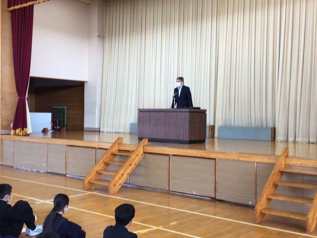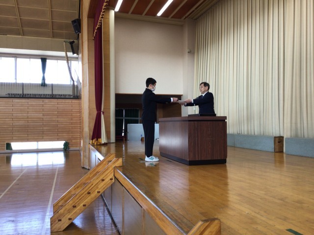 各学年の代表生徒に校長先生から修了証書が渡されました。校長先生のお話では、進級にあたる心構えや良い伝統を新入生に伝えていくようお話がありました。生徒指導の先生からは春休みの過ごし方についてお話がありました。