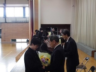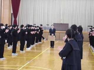 また、離任式の後には、ご退職となる齋藤高志校長先生に向けた“先生卒業式”を行い、生徒会長から卒業証書が手渡されました。
