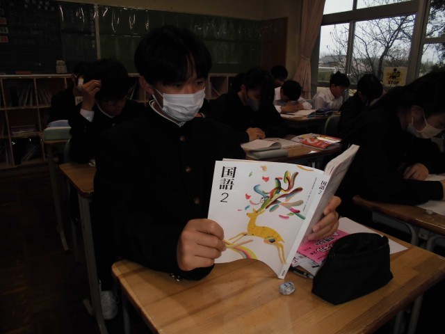 2年1組の国語の授業です。「アイスプラネット」という題名の文学作品に入りました。CDの範読を集中して聞いています。姿勢がとても正しい聞き方をしている生徒もいました。