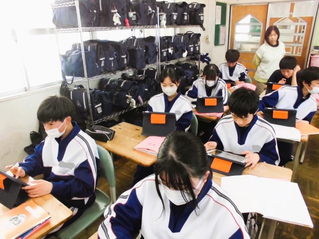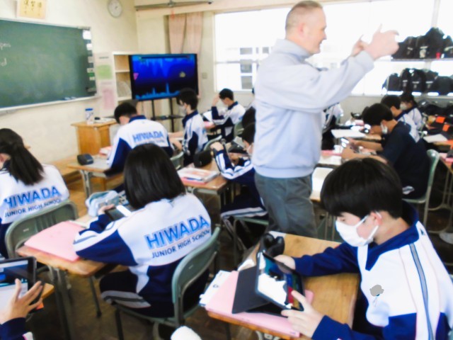 5校時目の1組の英語の授業です。今日はAETの先生が中心になって進めています。英語で質問された事柄にタブレットを用いて答える授業でした。答えが示されるたびに喜ぶ声があちこちから聞こえてきていました。