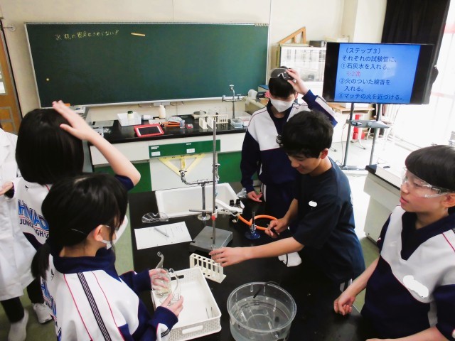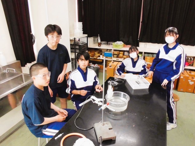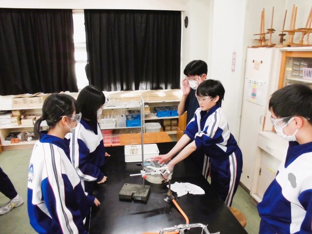 5校時目の2年2組の理科の授業です。炭酸ナトリウムを加熱するとどうなるかの実験でした。安全面に配慮しながら班長を中心に真剣に授業に取り組んでいました。集中しているのにカメラを向けてすみませんでした。ピースサインありがとうございます。