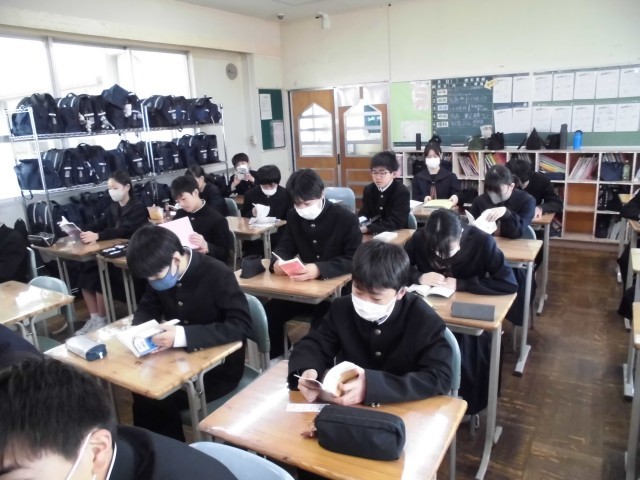 各クラスの朝読の様子です。どちらのクラスも静かに集中して朝読に取り組んでいます。読んでいる本は多岐にわたり、今日に限っていえば文学的作品だけでなく、自然科学などの本を読んでいる生徒が増えてきた印象です。中には世界の経済の動きを理解しようとして大変難しい本を読んでいる生徒もいました。