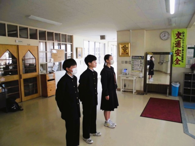 本日朝は3年生が修学旅行明けのため登校時間が遅いので、2年生の生徒会役員だけで朝の挨拶運動を行なっています。3人と人数は少ないのですが、一生懸命に登校してくる生徒に挨拶をしていました。暑い日も寒い日も、毎日頑張っている生徒会役員には頭が下がる思いです。