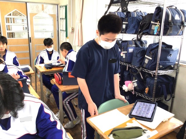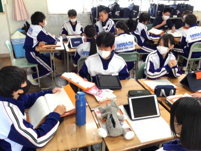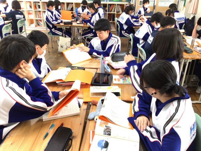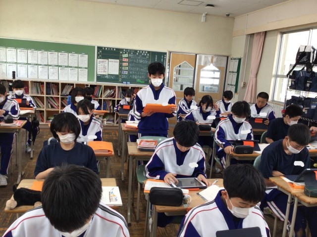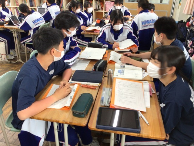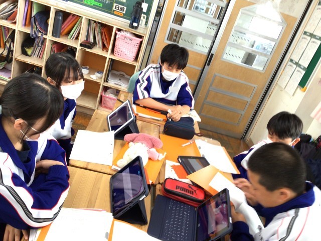 2組の国語の授業です。登場人物の感情について各自分析し、根拠をもって各班で説明する授業でした。細かい描写にこだわり、そのときの感情を堂々と班員に説明していました。みんな真剣に取り組んでおり、自分の捉え方と他の班員の捉え方を比較することで読みが深まりました。