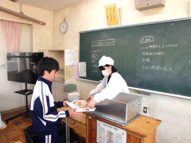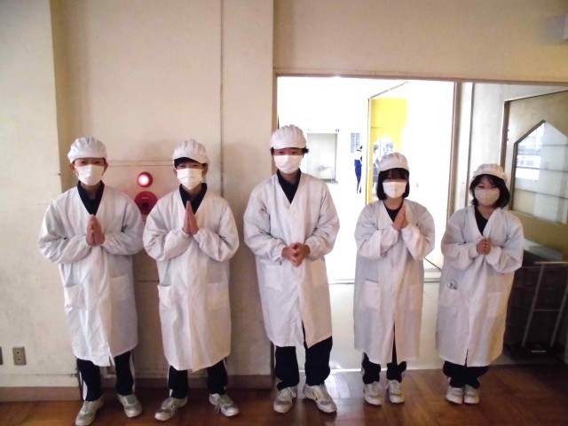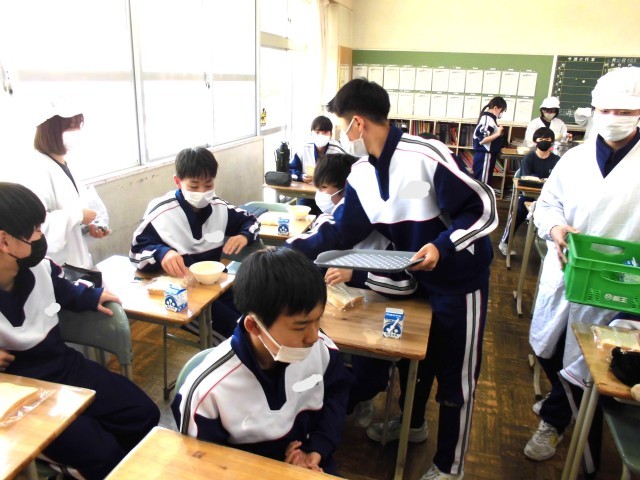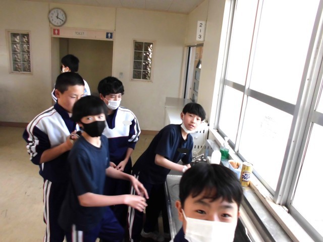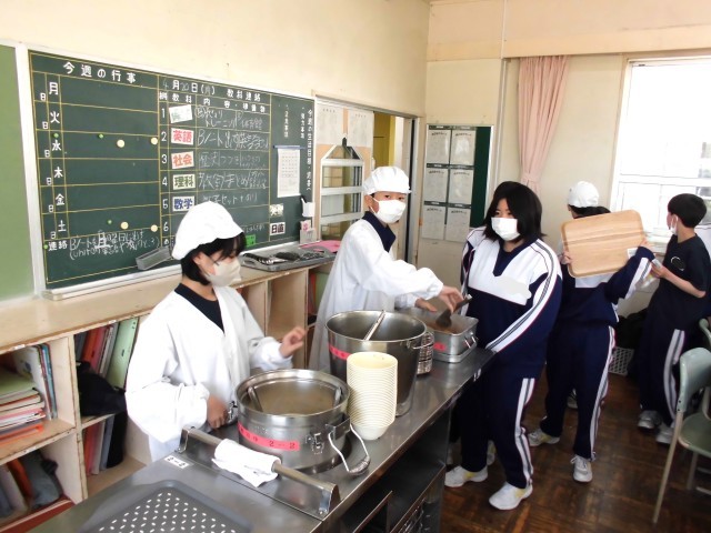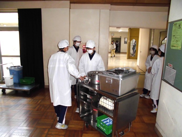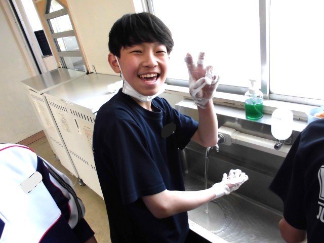 昨日の2組の給食の準備の様子です。給食当番が配膳室に来て、挨拶をして配膳台を教室に運びます。この際に健康観察や手の消毒の様子を確認します。教室内ではあらかじめ決められた分担によって整然と準備や盛り付けが行なわれます。給食当番以外に配膳の係の生徒がしっかりと仕事を行なっていました。係の生徒以外も衛生に気を遣い、隅々まで液体石けんを使い、しっかりと手を洗っています。