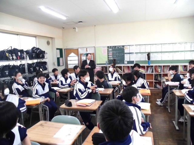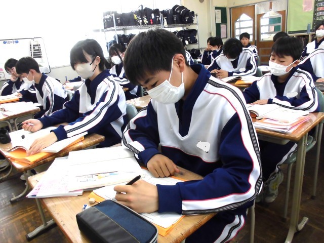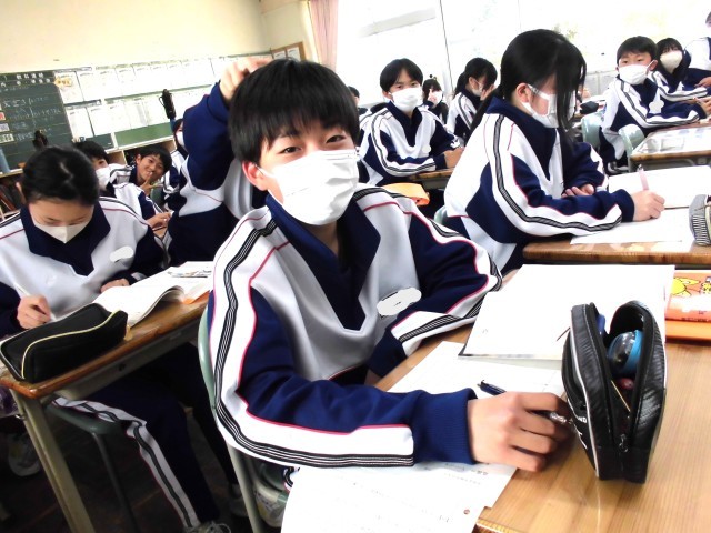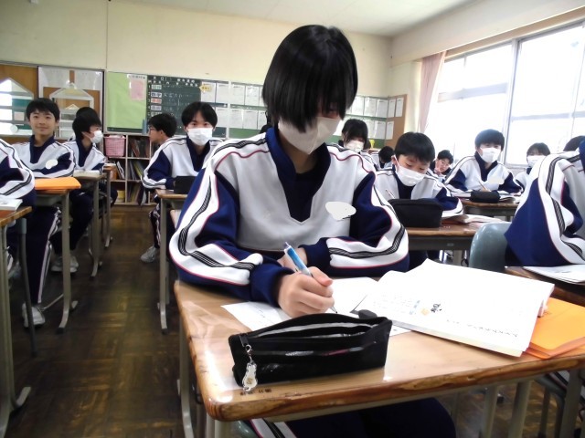 昨日、1組の国語の授業中に何やら見慣れぬ男性が近づいて扉の窓からのぞいていました。身を挺して子どもたちを守ろうと素早く近づいたところ、生徒が「校長先生だ!!」と叫び、あっけにとられていると、その人物は生徒が小学校時代にお世話になった校長先生でした。教室の中に入っていただき、子どもたちを参観されましたが、ある生徒が、小学校時代に合った思い出を話すと、ささいなエピソードでしたが、しっかりと覚えていらっしゃいました。自分も教師として生徒との思い出をずっとずっと大切にしたいと思いました。その後2組に移動されましたが、生徒は気持ちを切り替えて、書く作業が中心の授業だったのですが、黙々と取り組んでいました。