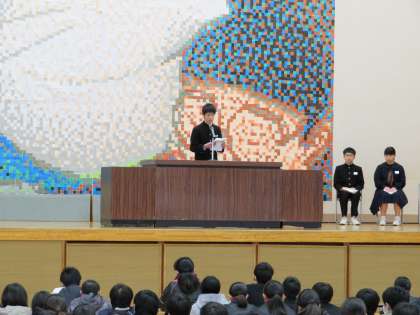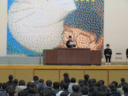 凜とした空気の中、体育館にて「三学期始業式」が執り行われました。今学期の抱負を述べた各学年代表生徒からは、受験に向けた具体的なプランや今年の目標とする漢字などを踏まえ、新年に対する期待と決意が伝わってきました。