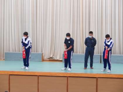 避難中、生徒たちは私語もなく、「お(押さない)・か(駆けない)・し(しゃべらない)・も(戻らない)」を意識して担任の先生の指示に従い冷静に行動していました。