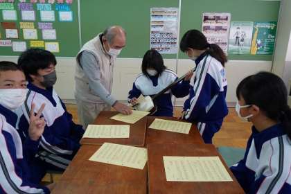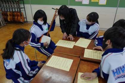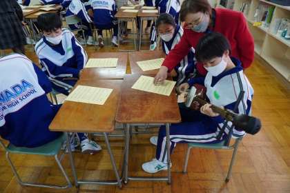 初めて「三味線」を弾いた感想はどうですか?先生方が丁寧に指導しています。