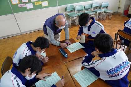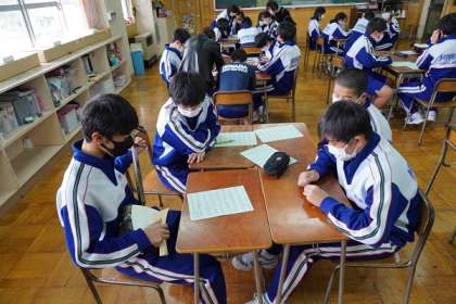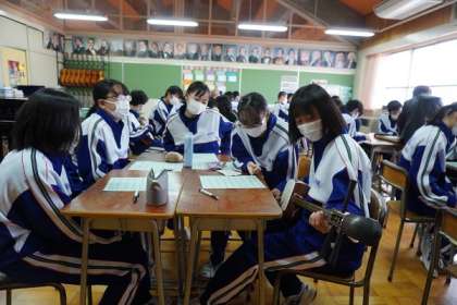 和楽器演奏「三味線」の学習です。昨年度は2時間学習しましたが、2年生は1時間のみです。