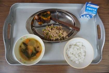 今日の給食は、「冬至献立」で、そぼろごはん、牛乳、冬至かぼちゃ、大根の味噌汁です。