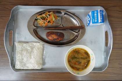今日の給食は、味噌チャーシューめん、牛乳、ミニココア揚げパン、小松菜のナムルです。