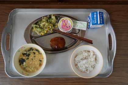 今日の給食は、「緑ヶ丘中学校の立案献立」で、麦ごはん、牛乳、和風ハンバーグ、キャベツの青じそサラダ、かき玉汁、桃ゼリーです。