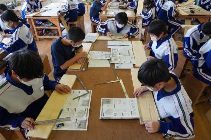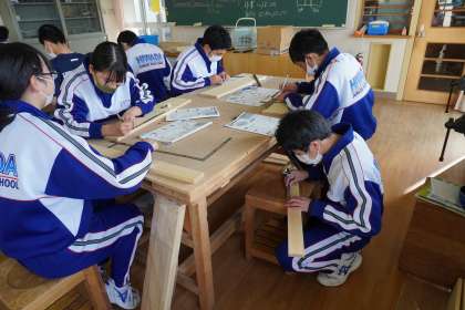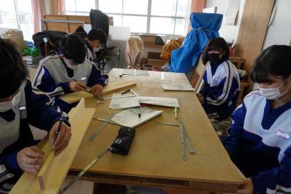自分が作りたい作品を「作品例」の中から選びます。自由設計でも構いません。作りたい作品が決まったら、木材に「さしがね」を使って「けがき」をします。寸法を間違えないように気をつけましょう。