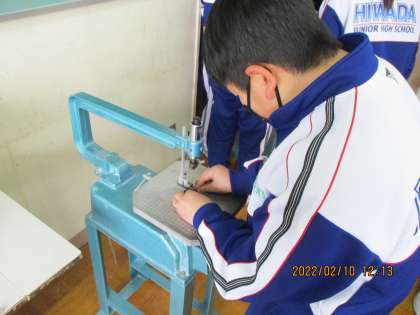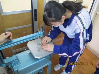 電動糸のこぎりを使って、堆朱のキーホルダーを作りました。