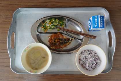 今日は「夏バテ予防献立」で、赤しそごはん、牛乳、いわしの南蛮漬け、きゅうりの浅漬け、肉団子となすの味噌汁です。