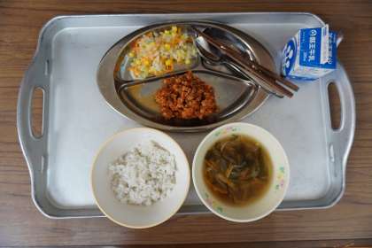 今日は「沖縄県郷土料理献立」で、タコライス、牛乳、タコライス用サラダ、沖縄風もずくスープです。