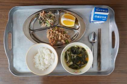 今日の給食は、そぼろ丼、牛乳、ごまネーズ和え、塩ワンタンスープ、河内晩柑です。