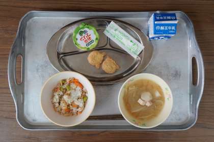 今日の給食は、たけのこ入りツナごはん、牛乳、たこナゲット、凍豆腐ともやしの味噌汁、お茶プリンです。