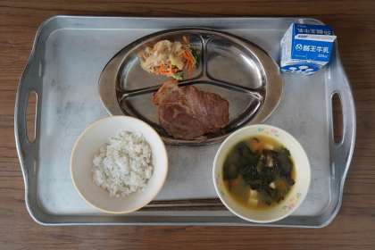 今日の給食は、麦ごはん、牛乳、豚のスタミナ焼き、チンゲン菜の和え物、トック入りスープです。