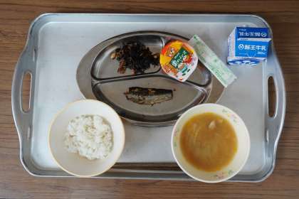 今日の給食は、あさか舞ごはん、いわし生姜煮、ひじきの炒め煮、豚汁、栗のムースです。