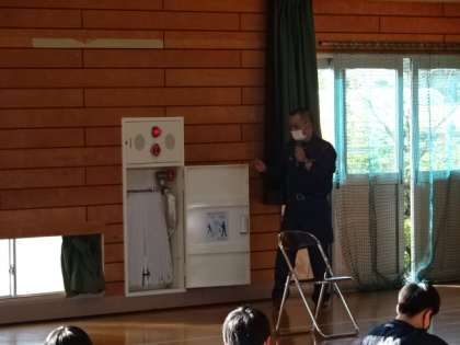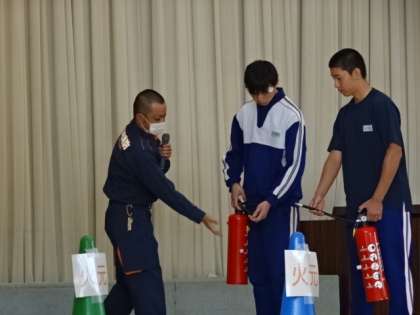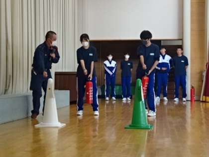 本日、6校時目に第2回避難訓練を実施しました。郡山消防署日和田分署の職員を講師にお招きし、避難訓練の様子を見て頂きました。また講話と消火器の使い方について説明を頂きました。実際に消火器を操作して、使い方について理解を深めることができました。