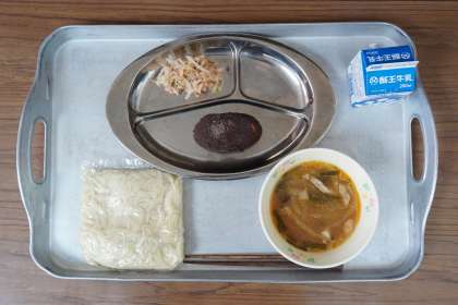 今日の給食は、味噌チャーシューめん、牛乳、キムチ和え、ミニココア揚げパンです。