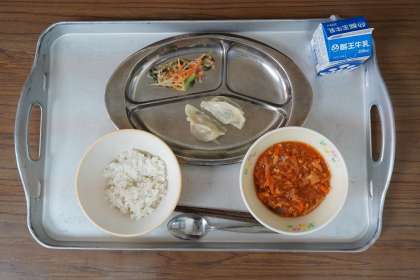 今日の給食は、麦ごはん、牛乳、ひじき入り餃子、ぶしマヨ和え、鶏肉と卵のチリソース煮です。