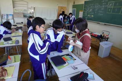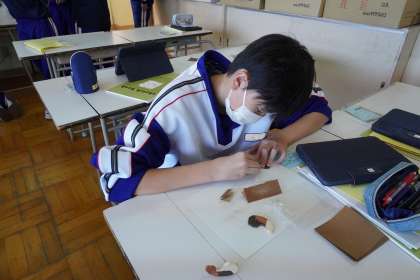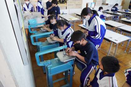 自分がデザインし形を電動糸のこぎりを使って切断します。切断が終わった生徒は、切断部分をヤスリがけし、きれいに仕上げています。