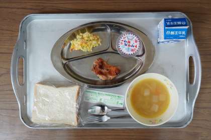 今日の給食は、米粉食パン、牛乳、チキンのトリュフ風味焼き、ペイザンヌサラダ、ポトフ、トリプルゼリーです。