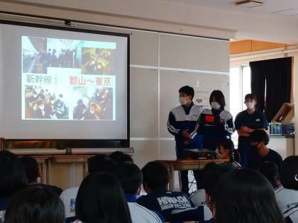 日和祭に向けて、各学級役員が中心となって準備を進めてきました。本番を前に学年発表を行った様子です。(修学旅行の報告など)