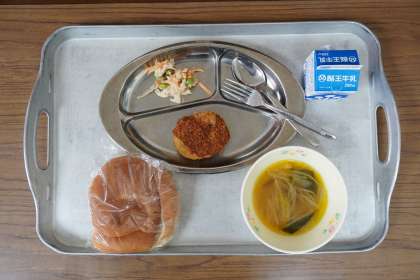 今日の給食は、丸型ドックパン、牛乳、コロッケのデミソース、秋野菜のサラダ、ジュリエンヌスープです。
