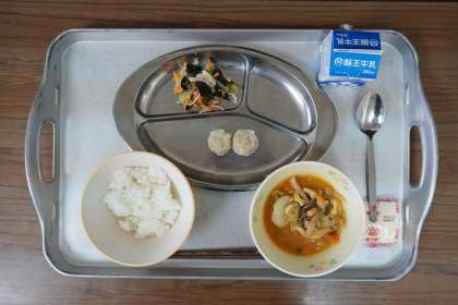 今日の給食は、あさか舞ごはん、牛乳、タッカルビ、ソフトチーズ、えびシューマイ、わかめの中華サラダです。タッカルビにソフトチーズをかけて、チーズタッカルビにして食べました。