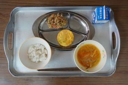 今日の給食は、麦ごはん、牛乳、かに玉、チャプチェ、キムチスープです。
