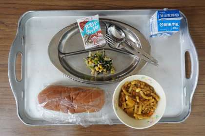 今日の給食は、減量黒糖パン、牛乳、マカロニのカレー煮、ひじき入りサラダ、アーモンド小魚です。