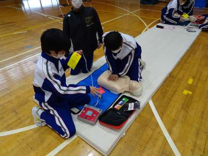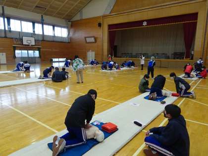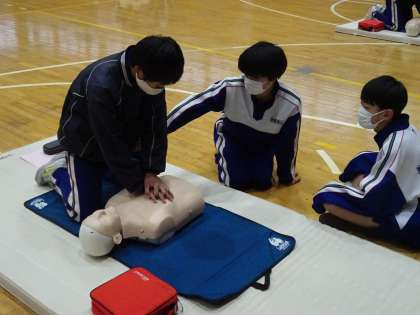 生徒たちは、指導員の説明をよく聞き、心臓マッサージ、人工呼吸、AED操作に真剣に取り組んでいました。